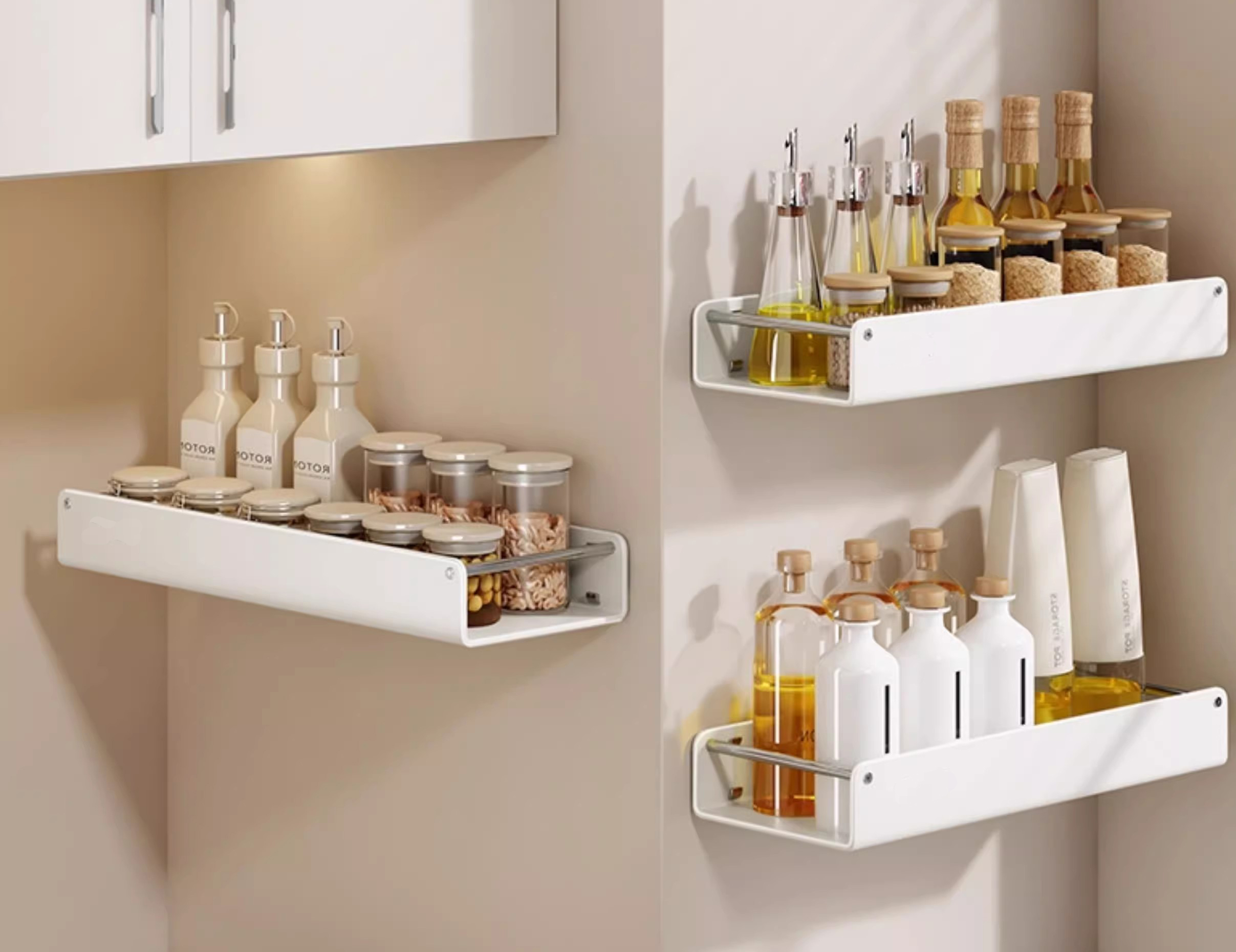 Suiteáiltear racaí balla go díreach ar an mballa, os cionn an sorn nó in aice leis an doirteal, rud a choinníonn na buidéil stáisiúin as an gcuntar go hiomlán. I gcás cistineacha beaga le cuntair chúnga, is féidir leis an dearadh seo 30% -50% de spás cuntair a shaoradh - go leor chun bord gearrtha nó pota beag a chur. Mar sin féin, tá cúinsí ann freisin: mar shampla, má tá an balla déanta as tíl nó drywall, an mbeidh an suiteáil cobhsaí? Tagann an chuid is mó de na racaí balla le scriúnna greamaitheacha nó leathnaithe láidir; Tá racaí greamaitheacha oiriúnach do bhallaí réidh tíleanna agus is féidir leo 2-3kg de mheáchan a iompróidh, agus is fearr le scriúnna leathnaithe le haghaidh ballaí tirime, ag cinntiú nach dtiteann an raca amach fiú le buidéil séasúir níos troime. Ina theannta sin, ní mór do racaí balla a bheith ar airde réasúnta - ró-ard agus tá sé deacair blastanas a ghlacadh, ró-íseal agus d'fhéadfadh sé go gcuirfí bac ar sceite an sorn. Moltar airde 50-60cm os cionn an sorn go ginearálta le haghaidh rochtain éasca.
